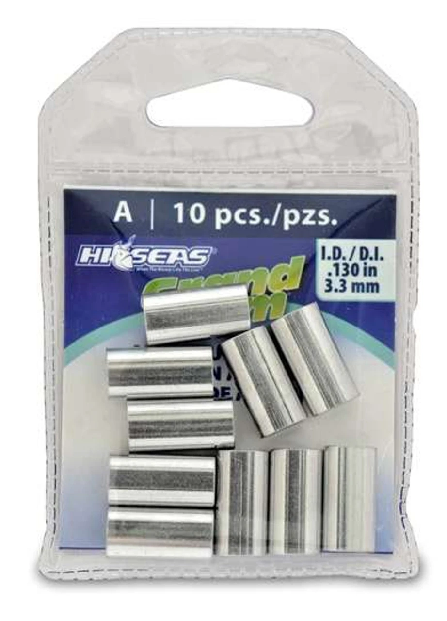The Hi-Seas Grand Slam Aluminum sleeves are tournament grade sleeves that are manufactured to exacting tolerances and are the crimp of choice for use with monofilament. Made from the perfect alloy so they will compress consistently without cracking. The sleeves are sized to match the diameter of Grand Slam Mono Leader.