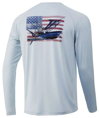 Huk KC Chasin Flags Pursuit Long Sleeve Shirts are made to deal with all elements on the water. They are lightweight crew neck shirts to keep you comfortable on those warmer days. Featuring HUK American flag and boat design on the back and small Huk logo on the front and down the sleeve. The perfect layering shirts for any angler.